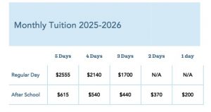 Generally, to keep pace with inflation, tuition is increased by 5% annually. Tuition is a fixed monthly fee, invoiced on the first of every month. Our Afterschool program is optional and carries an additional charge, based on number of days attended.